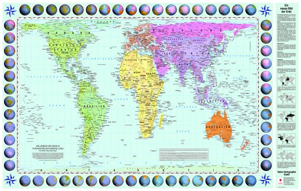 Alle Länder, Kontinente und Ozeane werden in zueinander vergleichbarer Flächengröße dargestellt und sind auf diese Weise unmittelbar miteinander vergleichbar.